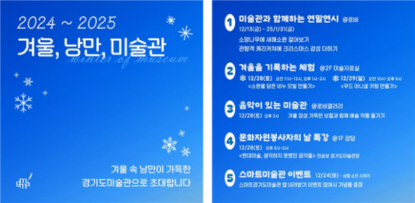 ‘겨울, 낭만, 미술관’의 다채로운 프로그램과 함께 경기도미술관의 낭만적인 풍경을 많은 분들이 즐길 수 있길 바란다.
