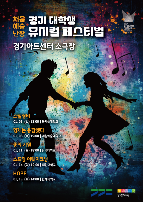 이번 ‘경기 대학생 뮤지컬 페스티벌 본선’에는 △동서울대학교 △예원예술대학교 △단국대학교, △대진대학교, △한세대학교 등 총 5작품을 선보이게 되며 2025년 1월 18일 오후 6시에 시상식이 개최될 예정이다.